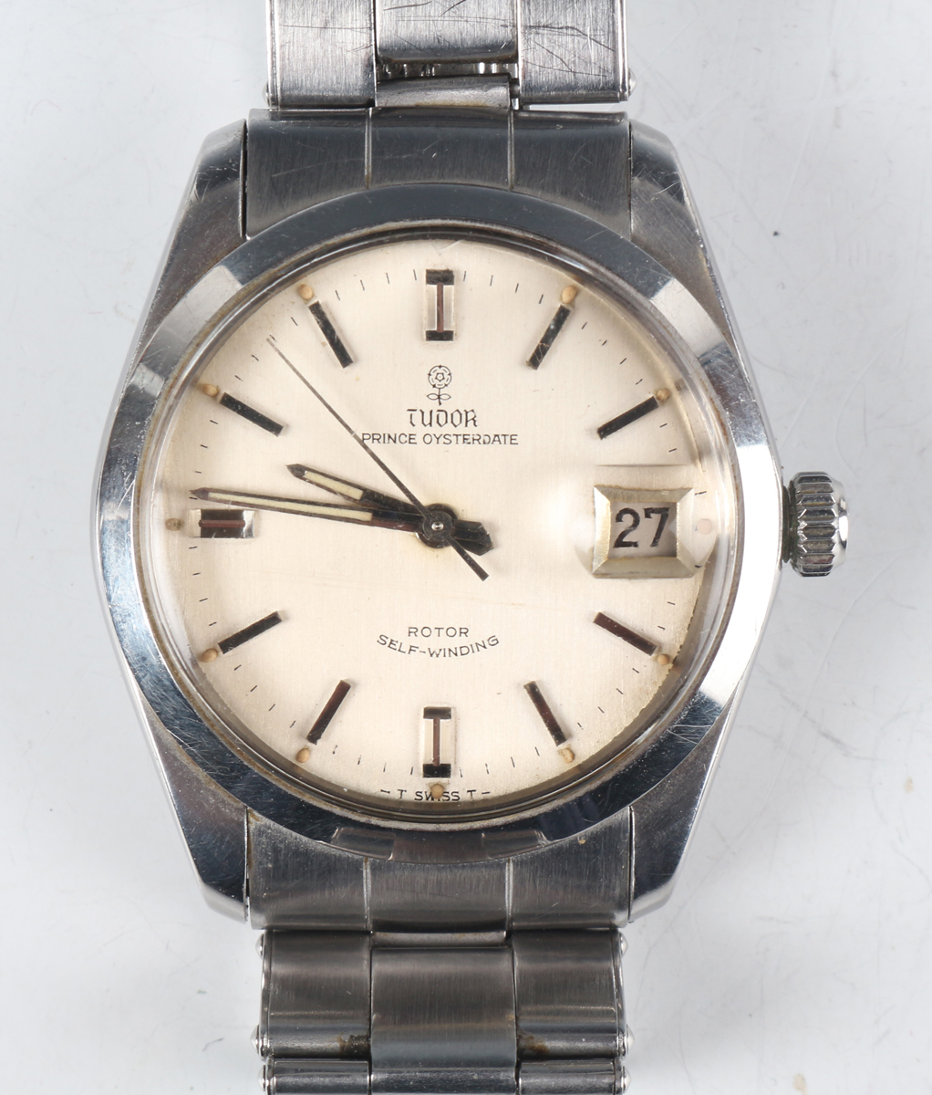 A Tudor Prince Oysterdate Rotor Self-Winding stainless steel gentleman's bracelet wristwatch, Ref 7996, circa 1960's, the signed silvered dial with baton hour markers, centre seconds and date aperture, the winding button with Rolex Crown, numbered between the lugs '7996' and '547885', the case back detailed 'Original Oyster Case by Rolex Geneva', the Rolex Oyster bracelet detailed '7205', with signed foldover clasp, numbered '67', case width 3.4cm.
