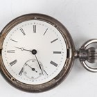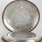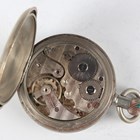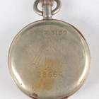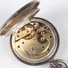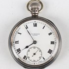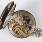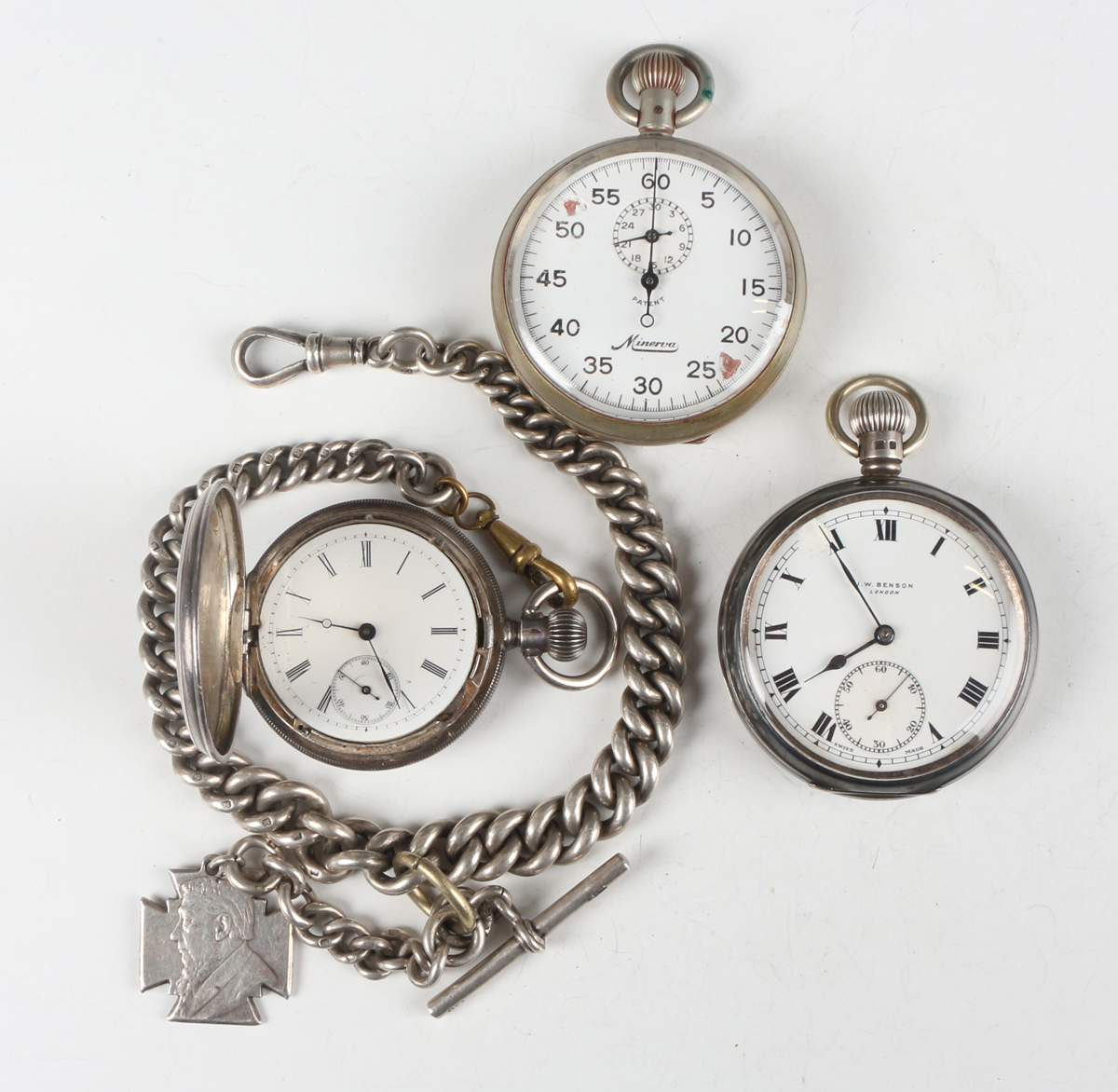A Longines 0.935 silver hunting cased keyless wind gentleman's pocket watch with signed and jewelled movement, the white enamelled dial with black Roman hour numerals and subsidiary seconds, with signed inner case and case back interior, case diameter 4.2cm, with a silver graduated curblink Albert watch chain, fitted with a T-bar and swivel, length 29.5cm, together with a J.W. Benson silver cased keyless wind open faced gentleman's pocket watch, London 1935, case diameter 4.9cm, and a Minerva MoD issue nickel cased keyless wind open faced pocket stop watch, the case back with MoD arrow and detailed 'Patt.3169' and numbered '28684', case diameter 5cm.