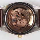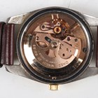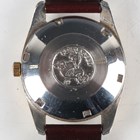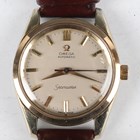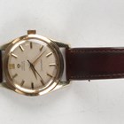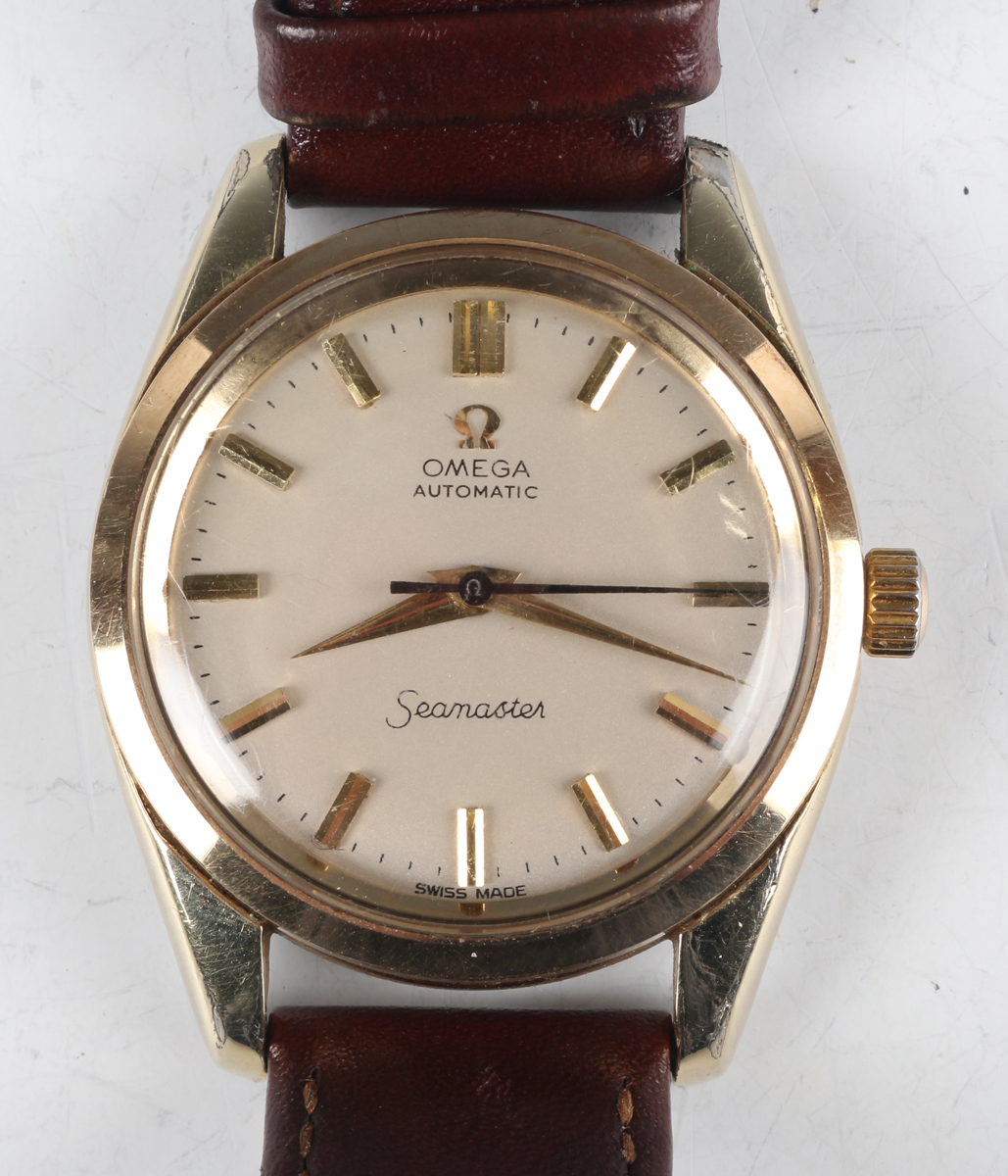 An Omega Seamaster Automatic gilt metal fronted and steel backed gentleman's wristwatch, Ref. 14710, circa 1958, the signed and jewelled 501 caliber movement numbered '16753524', the signed silvered dial with gilt baton hour markers, the signed case back interior detailed '14710 I SC', case diameter 3.5cm, on a brown leather strap.