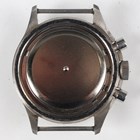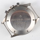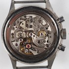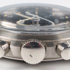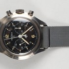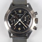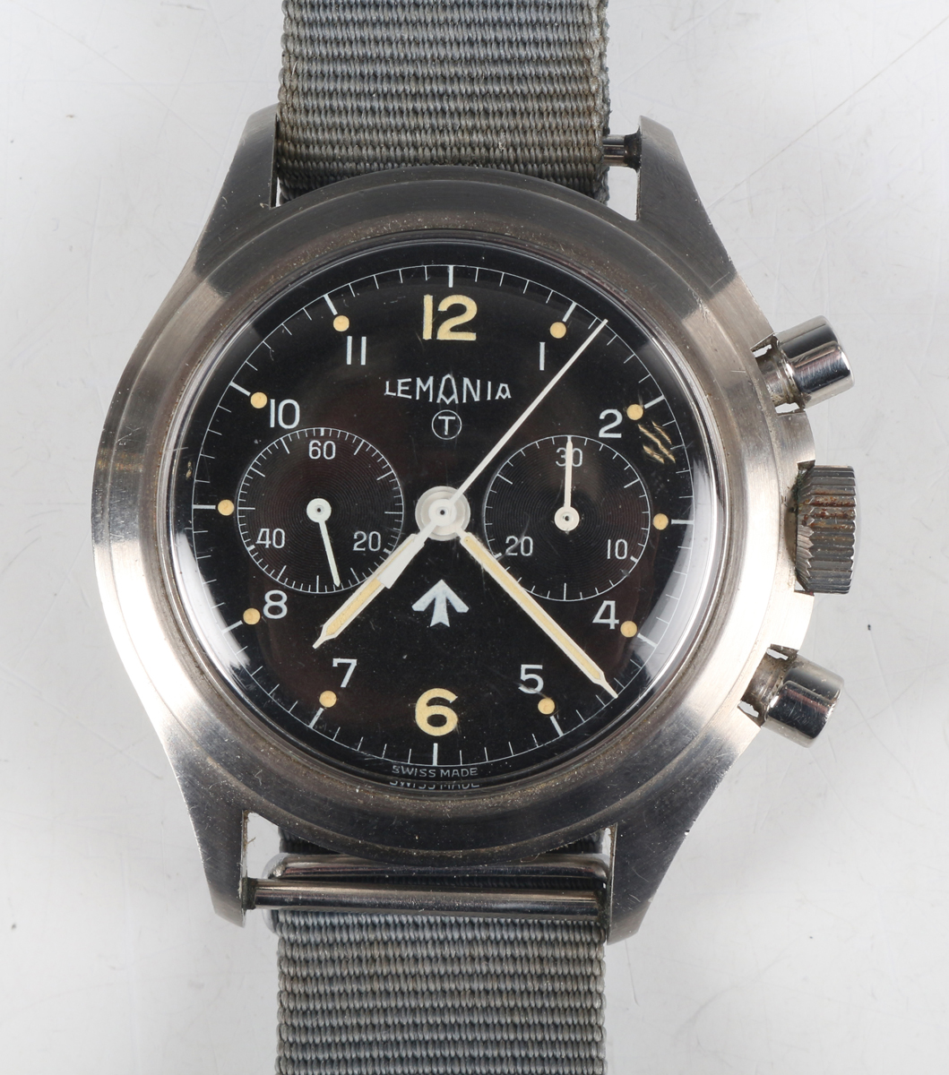 A rare Lemania MoD issue Royal Navy pilot's stainless steel circular cased 'Double Button' chronograph gentleman's wristwatch, circa 1975, the signed and jewelled 1872 caliber manual wind movement numbered '2654911', with dust cover, the signed black dial with Arabic numeral and dot hour markers, two subsidiary dials, MoD arrow and centre seconds, the case back detailed with MoD arrow above '0552/924-3306' and '4126/75', case width 4cm, on a grey NATO strap.