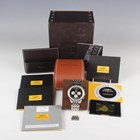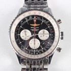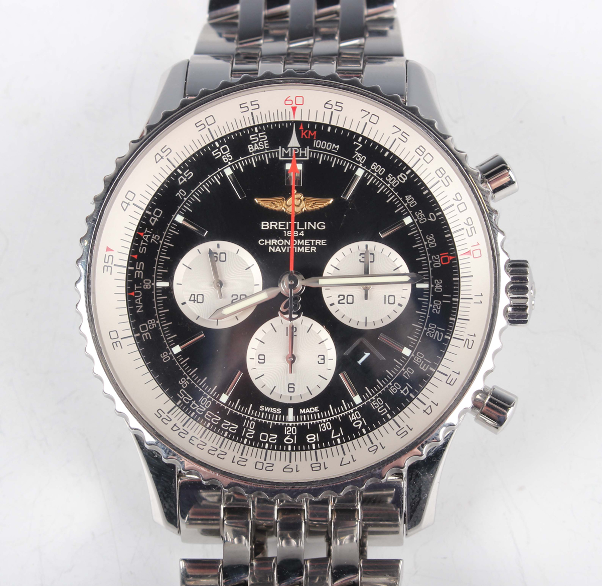 A Breitling Navitimer 01 Chronograph stainless steel gentleman's bracelet wristwatch, Ref. AB0127, circa 2016, with signed and jewelled BD1 caliber automatic movement, the signed black dial with silvered subsidiary dials and date aperture at 4 o'clock, the rotating bezel with silvered scale, the signed glazed exhibition back detailed 'AB0127' and numbered '3194174', the tapered link bracelet with signed foldover clasp, case diameter 4.6cm, with brown leather case and wallet, outer card box, International booklet, other related paperwork, including chronograph certificate, and spare links.