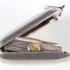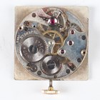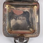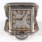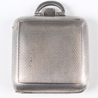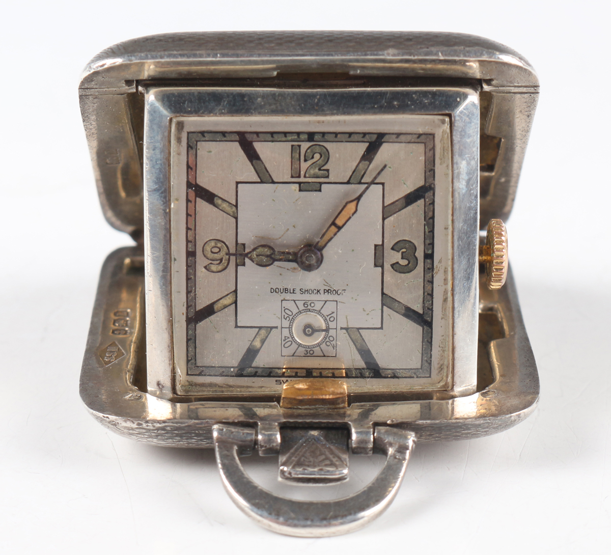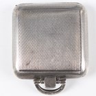 A George V silver square cased travelling purse watch, the jewelled manual wind movement detailed 'Sapho Geneve', the silvered square dial with Arabic hour numeral and baton hour markers, the case exterior with engine turned decoration, Birmingham 1935 by SSM, case width 3.8cm.