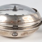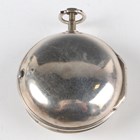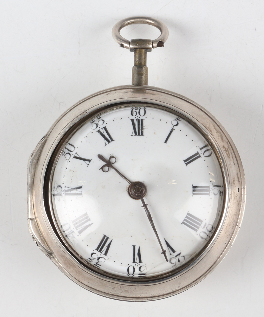 A George III silver pair cased keywind open-faced gentleman's pocket watch, the gilt fusee movement with verge escapement and pierced and engraved foliate balance cock, the backplate detailed 'J. Alchurch Cockston', the white enamelled convex dial with black Roman hours and outer Arabic minutes, the inner and outer cases Chester 1772 by John Wyke & Thomas Green, outer case diameter 5cm (repaired crack to dial).