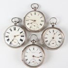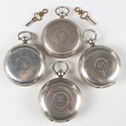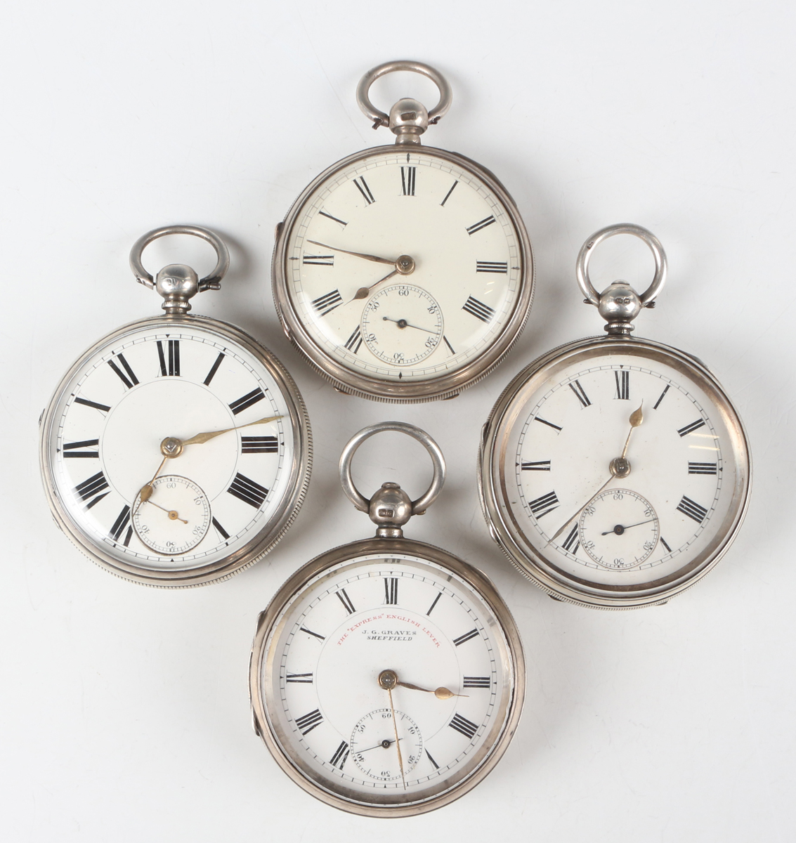 A late Victorian silver cased keywind open-faced gentleman's pocket watch, the gilt movement signed 'Adam Burdess Coventry', with gilt metal dust cover, the white enamelled dial with black Roman hour numerals and subsidiary seconds, London 1880, case diameter 5cm, together with a group of three similar late Victorian silver cased keywind open-faced gentlemen's pocket watches, diameters 5.1cm, with two winding keys.