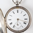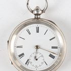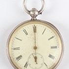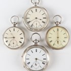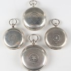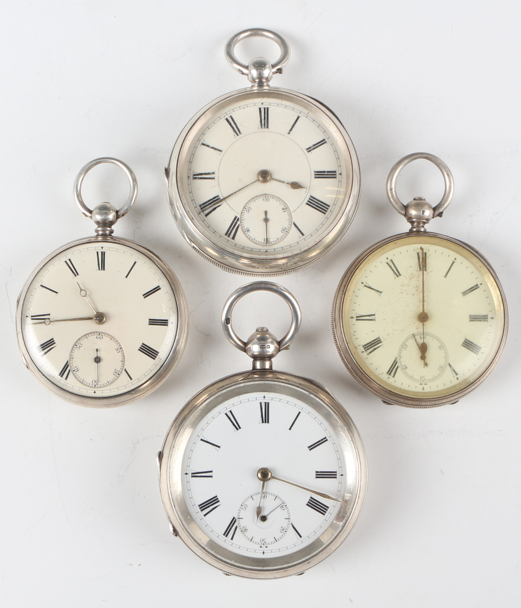 A George V silver cased keywind open-faced gentleman's pocket watch with unsigned gilt movement, the white enamelled dial with black Roman hour numerals, Birmingham 1915, case diameter 5.6cm, together with three other silver cased keywind open-faced gentlemen's pocket watches.