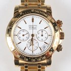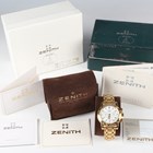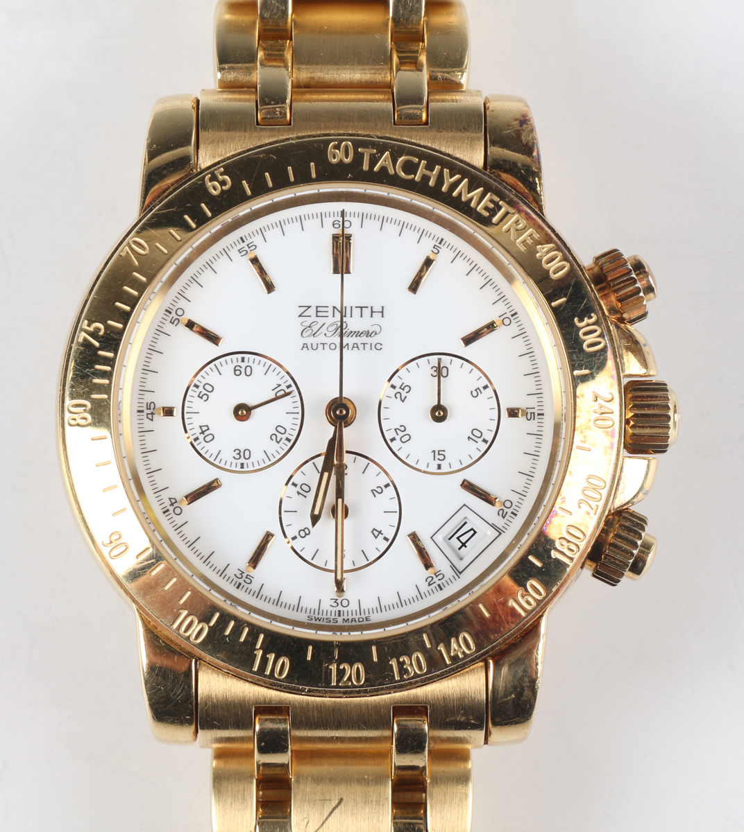 A Zenith El Primero Rainbow Automatic 18K gold gentleman's chronograph bracelet wristwatch with signed and jewelled 400 caliber movement, the signed white dial with gilt baton hour markers, three subsidiary dials, centre stop seconds and date aperture, the case with fixed tachymeter bezel and screw-down pushers, the signed case back interior detailed '18K 750', the link bracelet with signed foldover clasp, detailed '18K', total weight 178g, case diameter 4cm, with original green case (distressed), brown pouch, outer card box, international guarantee card, dated '31.3.93', instruction booklet and other related paperwork.