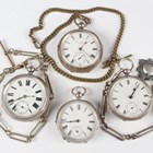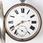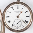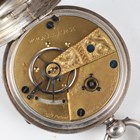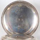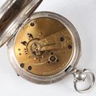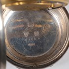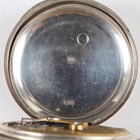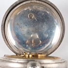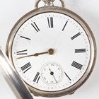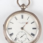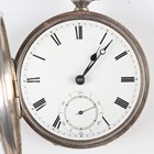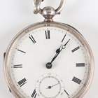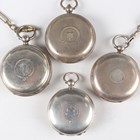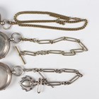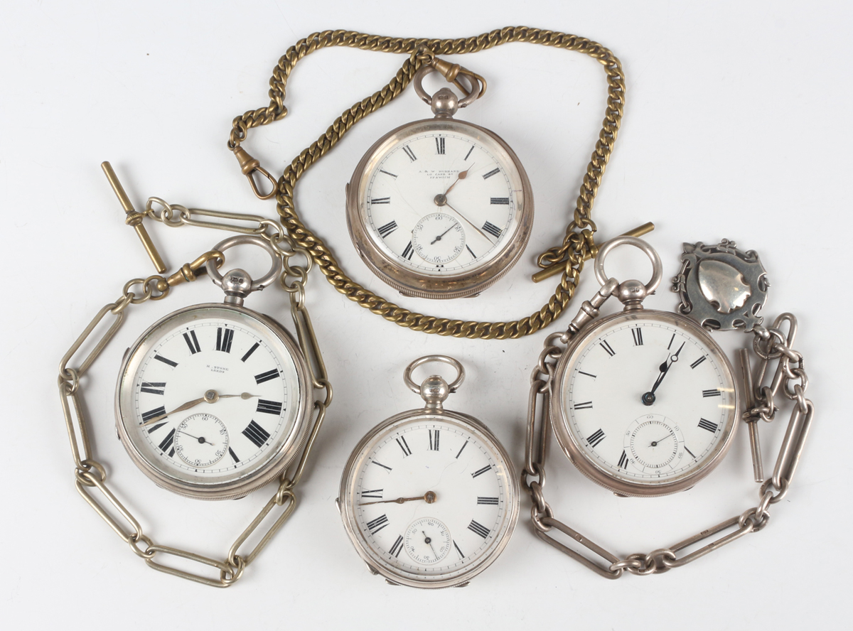 A late Victorian silver cased keywind open-faced gentleman's pocket watch, London 1874, case diameter 5.2cm, with silver trombone link Albert watch chain, length 24.7cm, together with three other silver cased keywind open-faced gentlemen's pocket watches, case diameters 5.5cm, 5.3cm and 4.8cm, and two base metal Albert watch chains.
