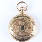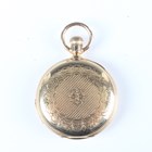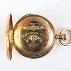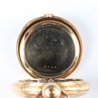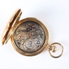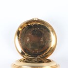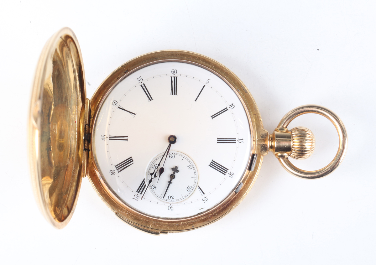 A Swiss 18K gold hunting cased keyless wind quarter repeating gentleman's pocket watch, the unsigned jewelled lever movement repeating on a coil, the white enamelled dial with black Roman hour and outer Arabic minute numerals and subsidiary seconds, the gold inner case back detailed 'Chronometre Repetition A 1/4, 29 Rubis Geneve', the case with engraved decoration, total weight 120.5g, case diameter 5.2cm.