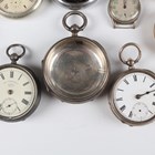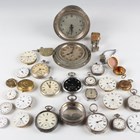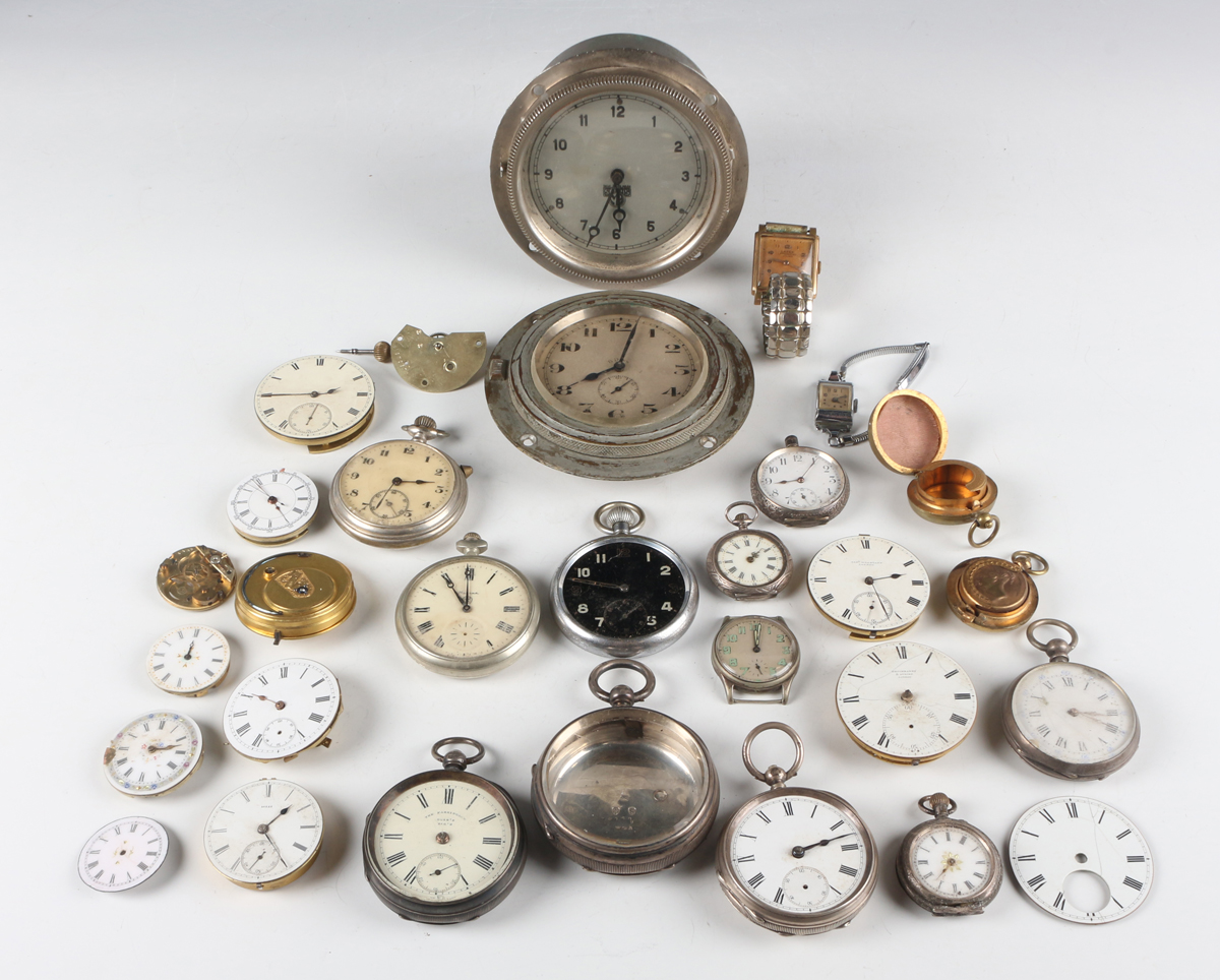 A silver cased keywind open-faced gentleman's pocket watch, Birmingham 1894, case diameter 4.9cm, a similar pocket watch, Birmingham 1884, and a silver pocket watch case, Birmingham 1892, together with a small collection of other pocket watches, dials, movements, three wristwatches, a Smiths automobile timepiece, another similar and two sovereign cases.