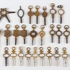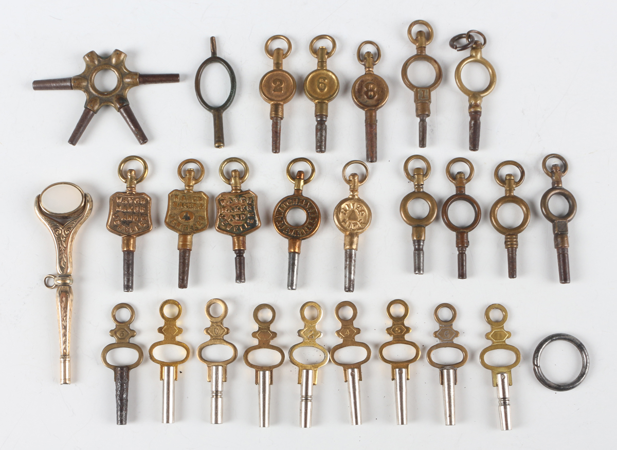 A Victorian gilt metal pocket watch key with engraved decoration and rotating banded agate and chalcedony terminal, length 5.7cm, together with a collection of twenty-one other pocket watch winding keys and four advertising watch keys.