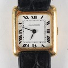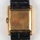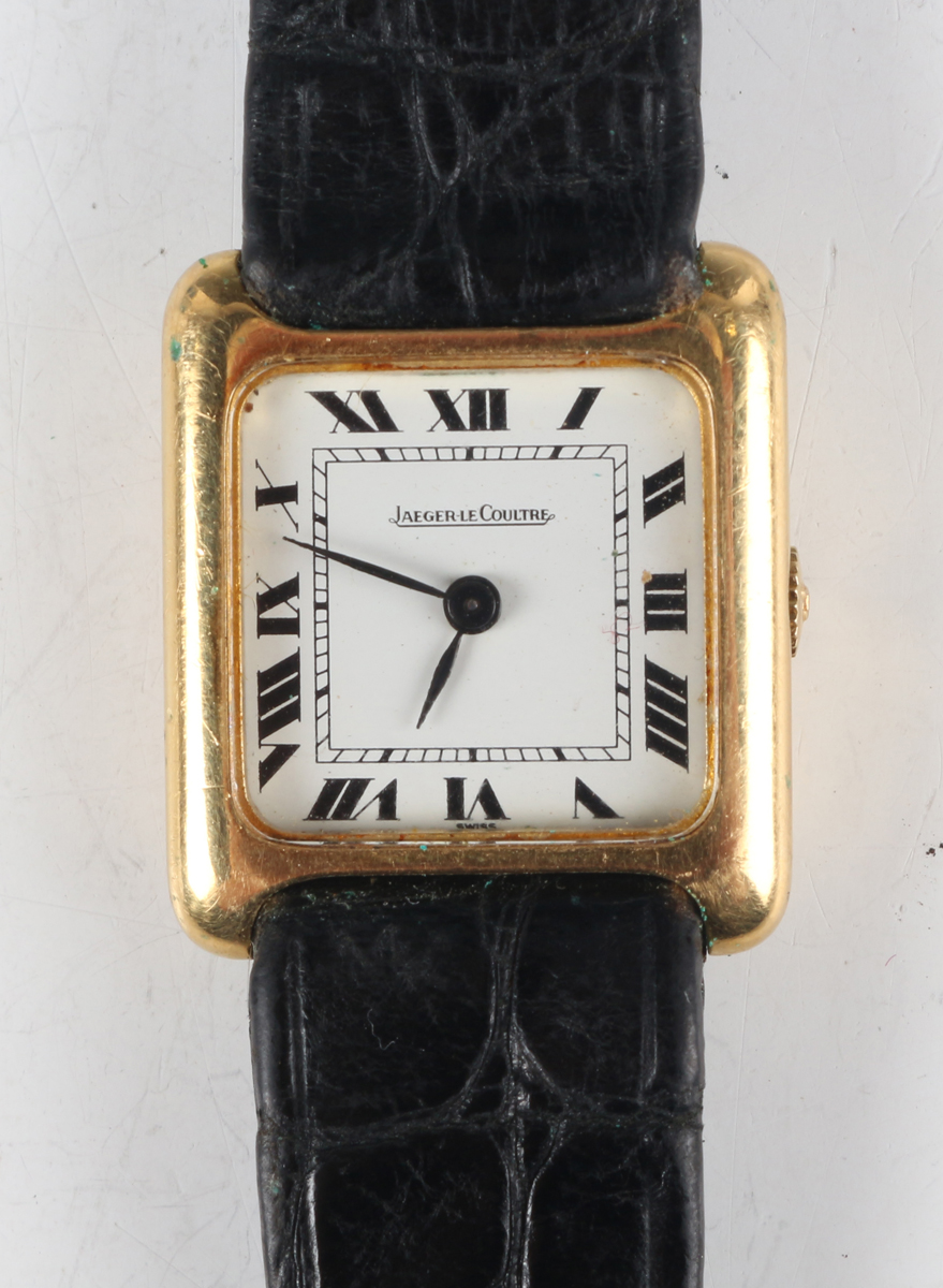A Jaeger-LeCoultre 18K gold rectangular tank cased lady's wristwatch with signed and jewelled 641 caliber manual wind movement, the signed square white enamelled dial with black Roman hour numerals, the signed case back interior detailed '18K 750', the case back numbered '6041.21' over '1.415.291', case width 2.1cm, on a black leather strap.