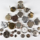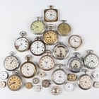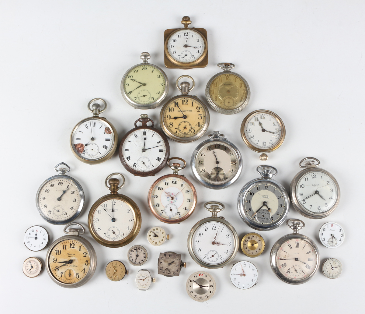 A collection of pocket and wristwatch movements and dials, with some signed, including Waltham, and a small group of pocket watches.