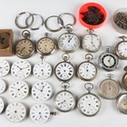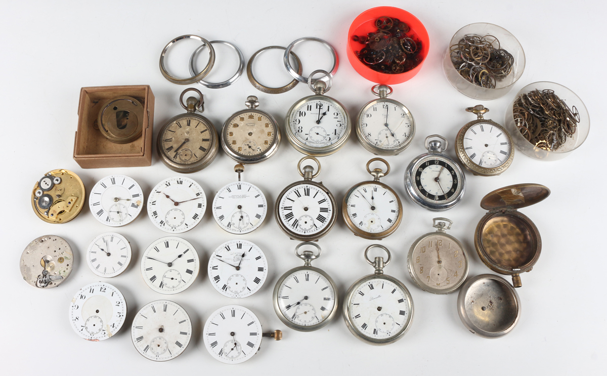 A small collection of gentlemen's pocket watches, together with various pocket watch movements and dials, with some signed, including 'Kendal & Dent...' and 'Thomas Russell & Son'.