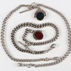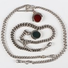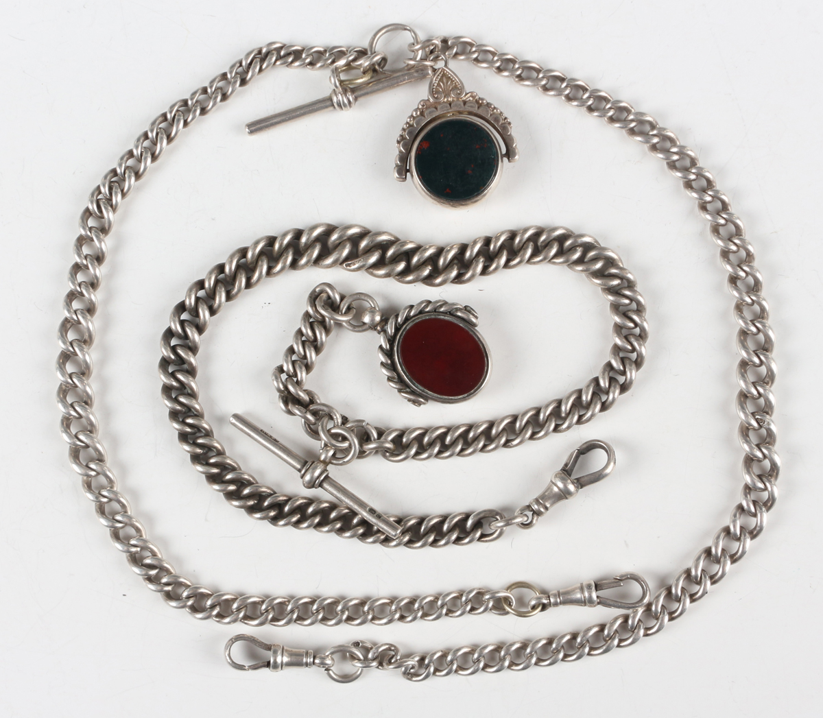 An Edwardian silver graduated curblink Albert watch chain, fitted with a T-bar and swivel, Birmingham 1902 by Henry Allday & Son, length 31cm, hung with a silver mounted bloodstone and cornelian rotating fob, total weight 60.7g, together with a similar silver Albert watch chain, fitted with a T-bar, two swivels and a bloodstone and cornelian rotating fob, weight 58.2g, total length 52cm.