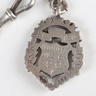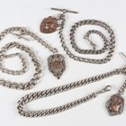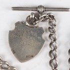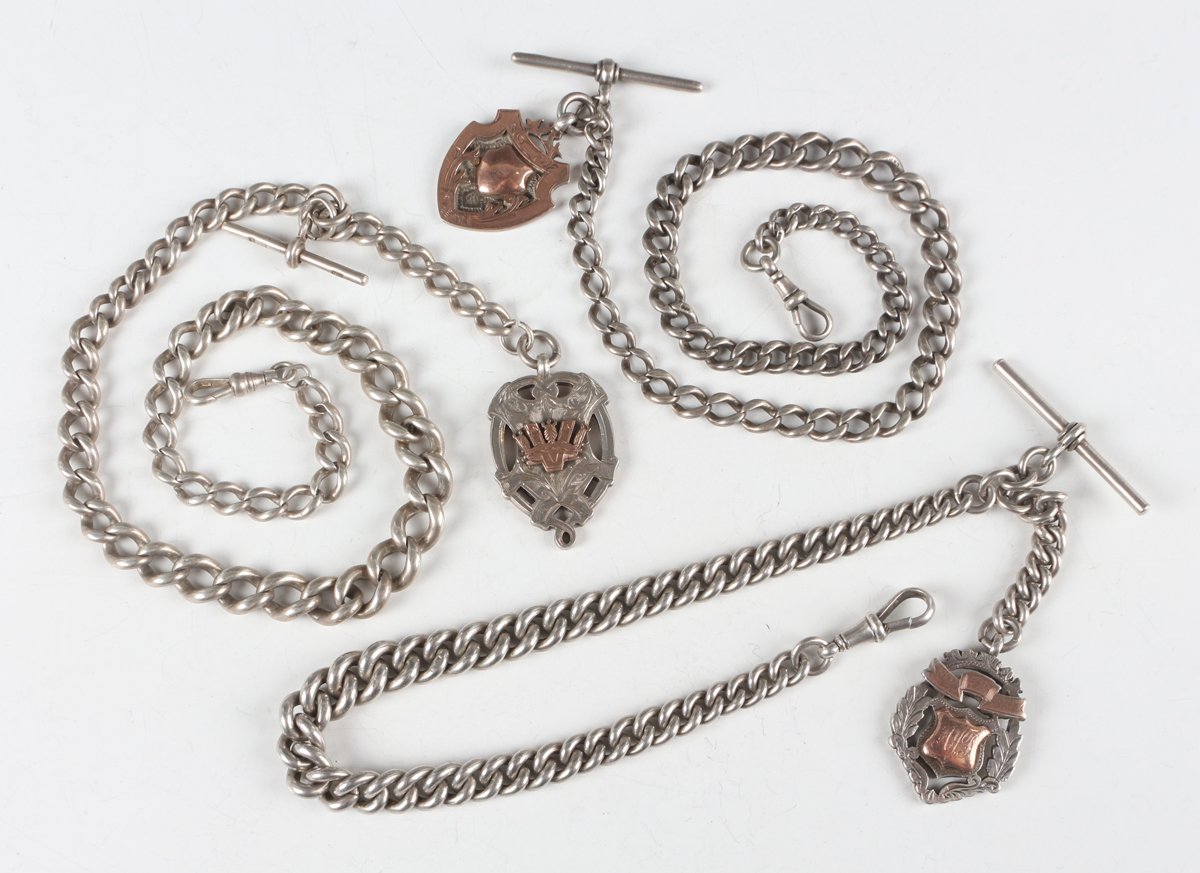 A group of three silver graduated curblink Albert watch chains, each fitted with a T-bar, swivel and fob medallion medal, lengths 35.5cm, 41.5cm and 47cm, total weight 186g.