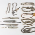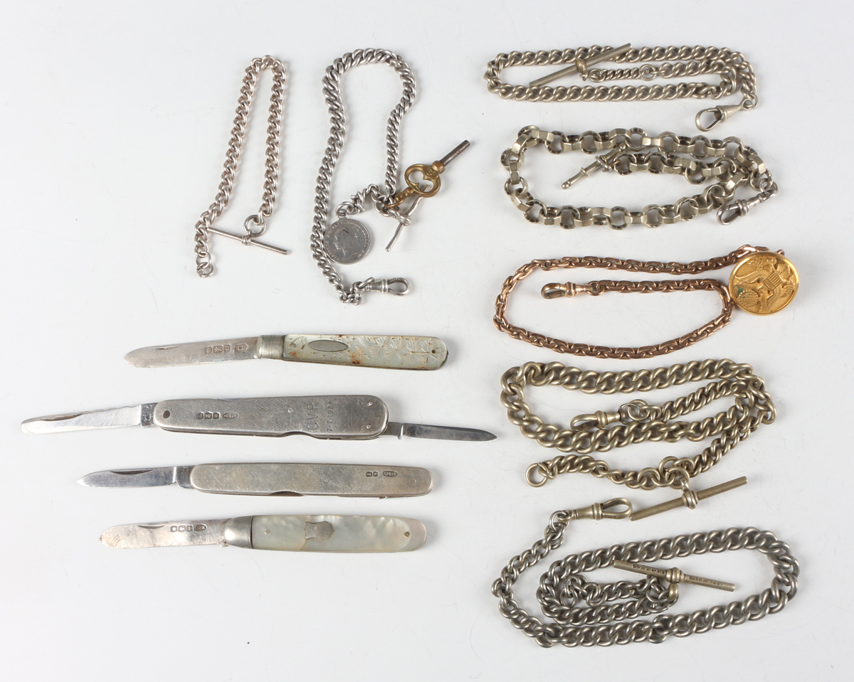 Two lengths of silver curblink watch chains, weight 32.5g, together with four silver mounted folding pocket knives and five base metal Albert watch chains.