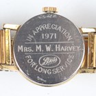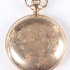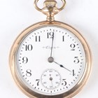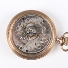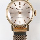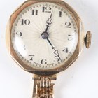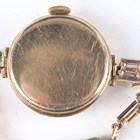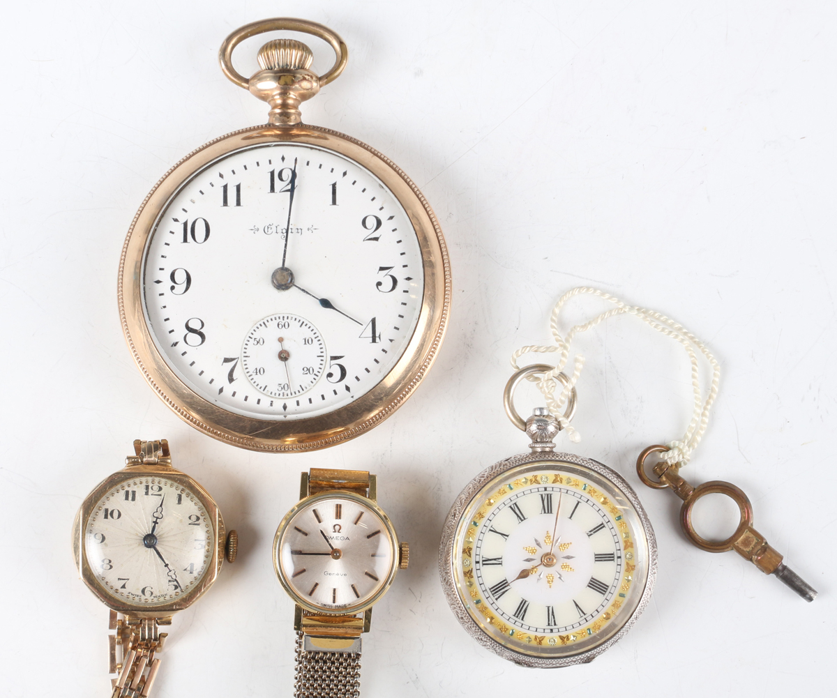 A 9ct gold cased lady's wristwatch, Birmingham 1934, case width 2.4cm, on a gilt metal bracelet, together with an Elgin gilt metal cased gentleman's pocket watch, case diameter 5.4cm, a silver cased lady's fob watch and an Omega gilt metal fronted and steel backed circular cased lady's wristwatch.
