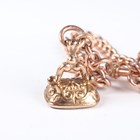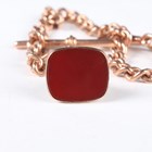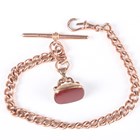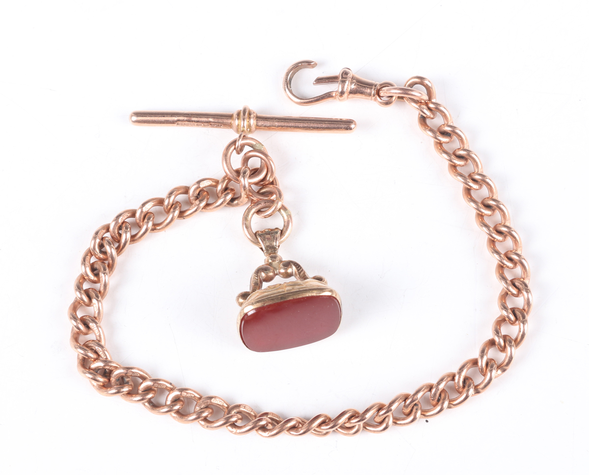 A 9ct rose gold curblink Albert watch chain, fitted with a T-bar and swivel, Sheffield 1990, weight 16.9g, length 21cm, hung with a gold cased chalcedony fob.