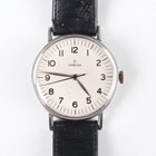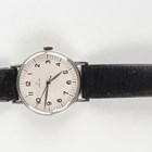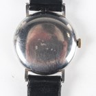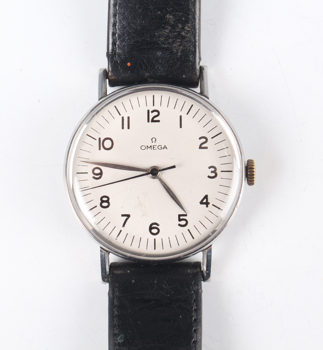 An Omega steel circular cased gentleman's wristwatch, Ref. 2346/2, circa 1944, the signed and jewelled 30T2 SC caliber manual wind movement numbered '10406717', the signed silvered dial with black Arabic hour numerals, the signed case back interior numbered '2346/2', case diameter 3.5cm, on a black leather strap with Omega buckle.