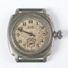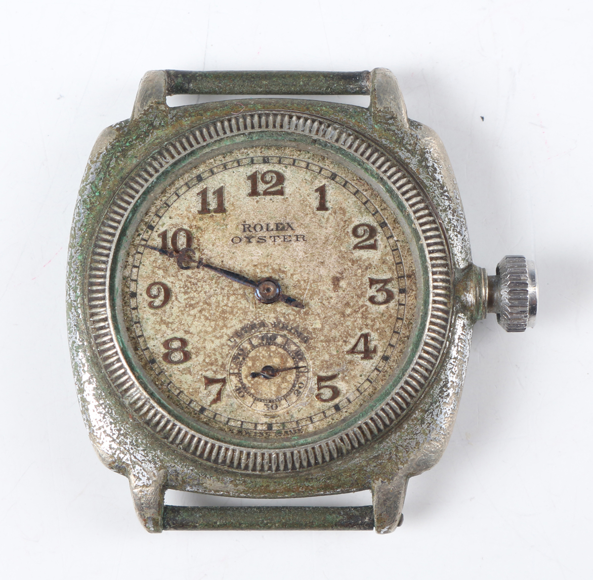 A Rolex Oyster Ultra Prima chrome cushion cased gentleman's wristwatch, Ref. 1072, circa 1938, the signed circular dial with gilt Arabic hour numerals and subsidiary seconds, the case with milled bezel, the winding button detailed 'Oyster Patent', the case back numbered '44887' above '1072', case width 3.2cm.