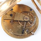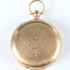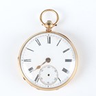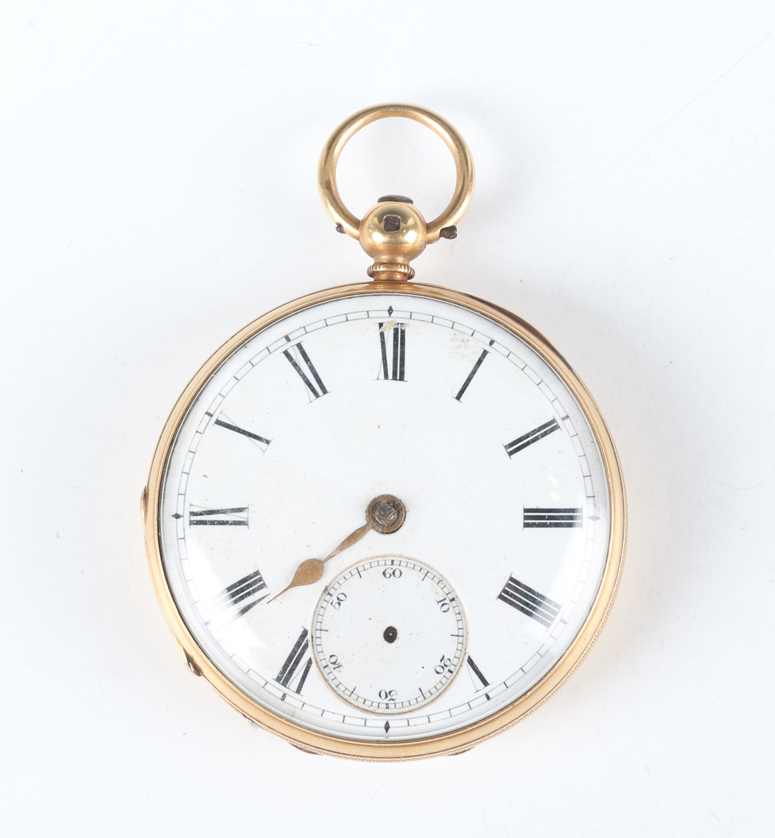 A Victorian 18ct gold cased keywind open-faced gentleman's pocket watch with unsigned jewelled movement, the white enamelled dial with black Roman hour numerals and subsidiary seconds, the case back with engine turned decoration, Chester 1866, total weight 76.5g, case diameter 4.4cm.