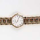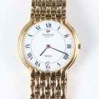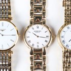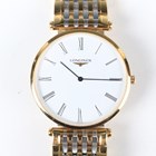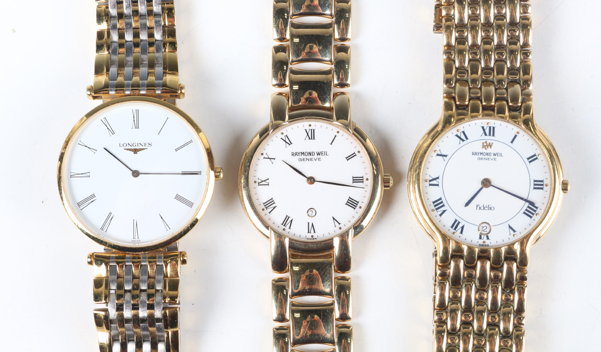 A Longines 'La Grande Classique de Longines' gilt metal and steel gentleman's bracelet wristwatch, Ref L4 709 2, with quartz movement, the signed white enamelled dial with black Roman hour numerals, the signed case back numbered '34534575', the two colour link bracelet with signed foldover clasp, case diameter 3.2cm, together with two Raymond Weil gilt metal gentlemen's bracelet wristwatches, case diameters 3.2cm and 3.1cm.