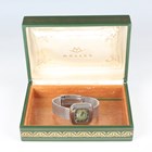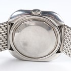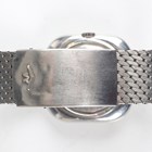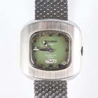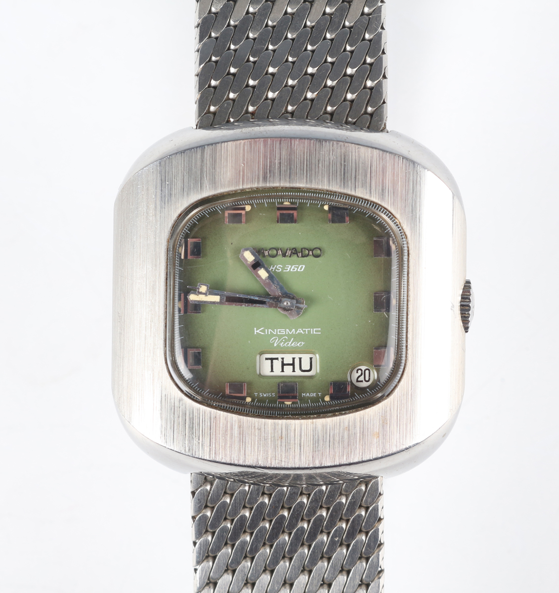 A Movado HS 360 Kingmatic Video stainless steel gentleman's bracelet wristwatch, circa 1970s, with signed and jewelled automatic movement, the signed green dial with silvered hour markers, day aperture at 6 o'clock and date aperture to lower right corner, the brushed steel TV-shaped case with screw back, detailed 'Sub-Sea' and numbered '1183', the mesh link bracelet with signed foldover clasp, case width 3.6cm, with Movado green case.