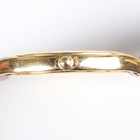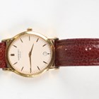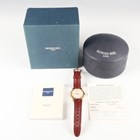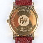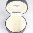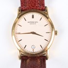 A Raymond Weil Genève gilt metal oval cased gentleman's wristwatch, Ref. 5571, with quartz movement, the signed peach tinted dial with gilt baton hour numerals and date aperture, the signed case back numbered '5671' above 'X430986', case width 3.2cm, on a brown leather strap, with circular case, outer card box, international guarantee booklet and card, dated '4/3/03'.
