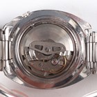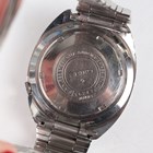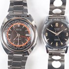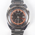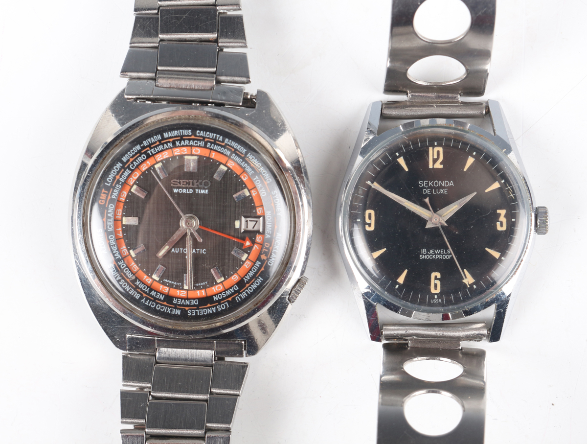 A Seiko World Time Automatic stainless steel gentleman's bracelet wristwatch, Ref. 6117-6400, circa June 1971, with signed and jewelled 6117B caliber movement, the signed black 12 and 24 hour dial with silvered baton hour markers, date aperture and Cities of the World rotating inner bezel, the signed case back detailed '6117-6400' and numbered '162470', the tapered link bracelet with signed foldover clasp, case width 4cm, together with a Sekonda De Luxe steel cased gentleman's wristwatch with manual wind movement and signed black dial, case diameter 3.3cm, on a steel bracelet.
