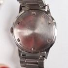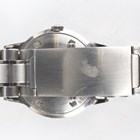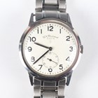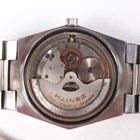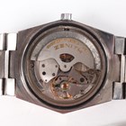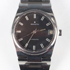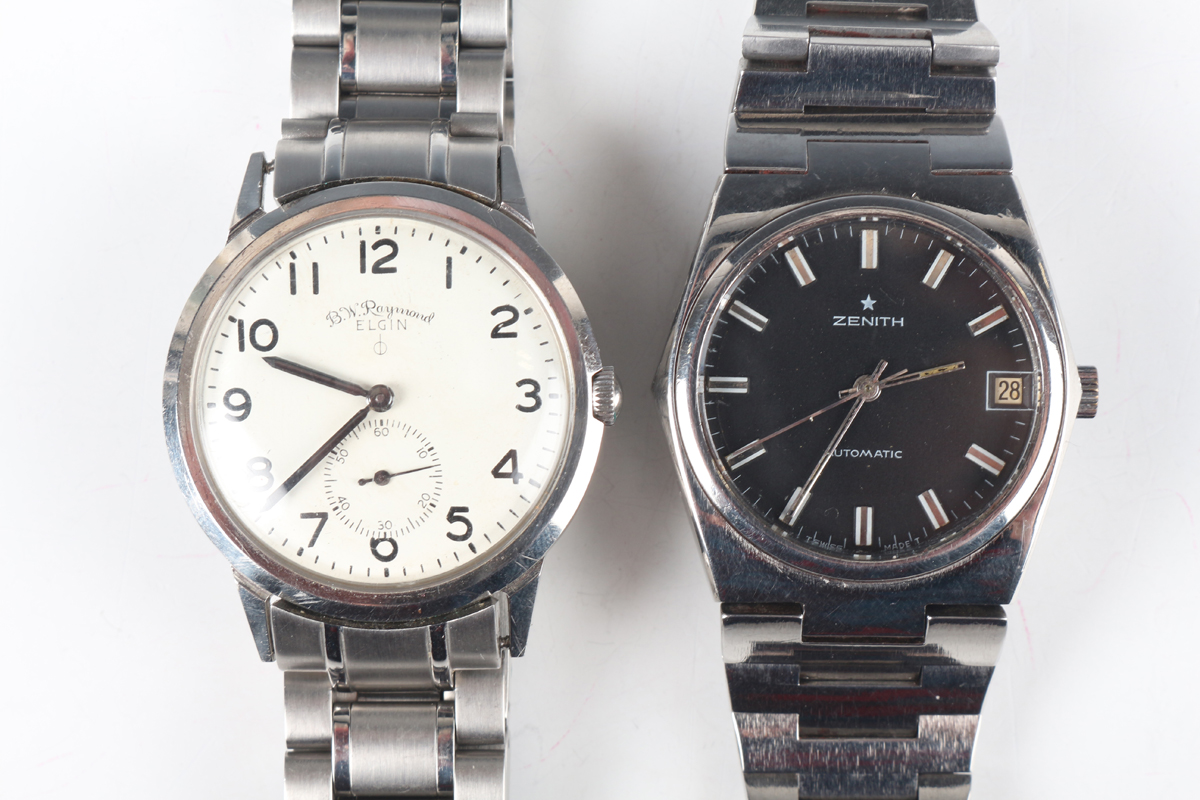A Zenith Automatic stainless steel gentleman's bracelet wristwatch, Ref. 02 0690 380, with signed and jewelled 2572 PC caliber movement, the signed black dial with silvered baton hour markers and date aperture, the case back numbered '02 0690 380', the tapered link bracelet with signed foldover clasp, case width 3.5cm, together with a B.W. Raymond Elgin stainless steel gentleman's wristwatch with signed and jewelled manual wind movement, the signed dial with black Arabic hour numerals and subsidiary seconds, case diameter 3.6cm, on a bracelet with foldover clasp.