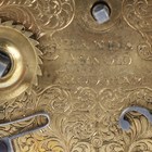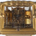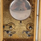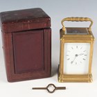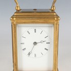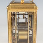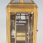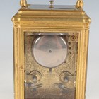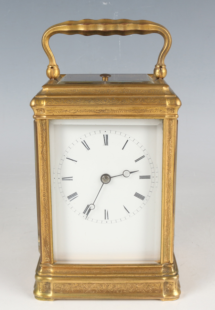 A mid-19th century engraved brass gorge cased carriage clock, the eight day movement with foliate engraved platform escapement, striking hours and half hours and repeating on a bell, the foliate engraved backplate detailed 'Arnold & Frodsham', the white enamelled dial with black Roman hour numerals, the foliate engraved gorge case with swing handle and bevelled glass panels, height 15.5cm, with winding key and a travelling case.