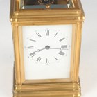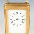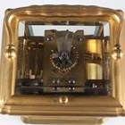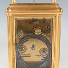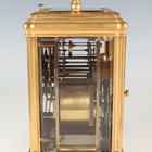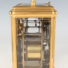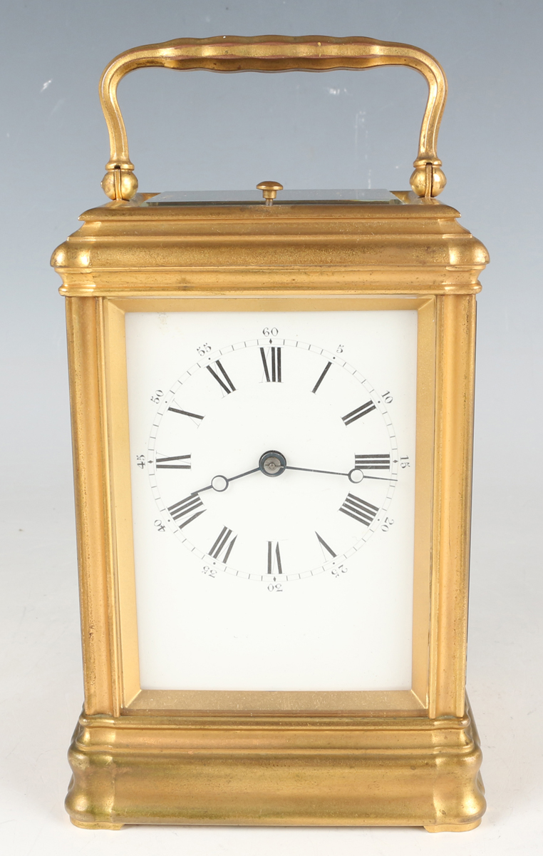 A late 19th century French lacquered brass gorge cased grand sonnerie carriage clock, the eight day movement striking quarters and repeating on two gongs, the backplate stamped 'C.V' (Charles Voisin) and numbered '24676', the white enamelled dial with black Roman hour numerals and outer Arabic minutes, the gorge case with swing handle and bevelled glass panels, the underside with three position setting lever for 'Striking', 'Silent' and 'Full Striking', height 17.5cm, with original numbered winding key. Note: Charles Voisin was a Parisian retailer who was supplied with carriage clocks by a variety of different makers, including Drocourt.