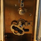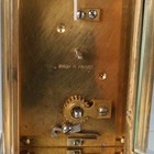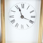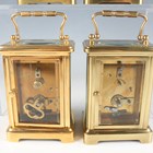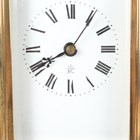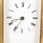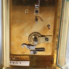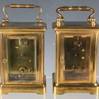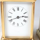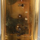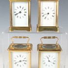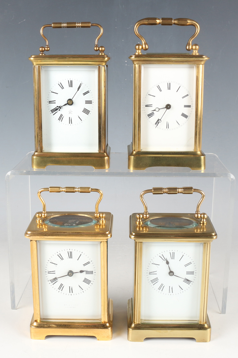A group of four early 20th century French brass corniche cased carriage timepieces, each with eight day movement and white enamelled dial, heights 14cm to 14.5cm, with winding keys.