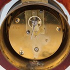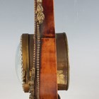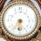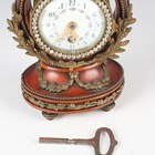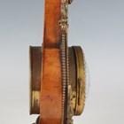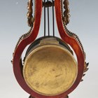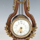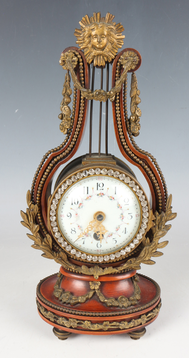 A late 19th century French gilt metal mounted stained beech Marie Antoinette style mantel timepiece, the eight day movement with platform escapement, the circular enamelled dial with black Arabic hour numerals and floral festoons, framed by a colourless paste set surround, the lyre shaped case with sunburst mask surmount above festoons and wreaths, on toupie feet, height 27cm, with winding key.