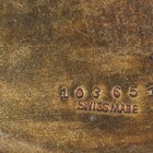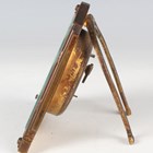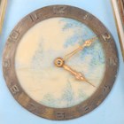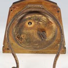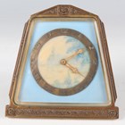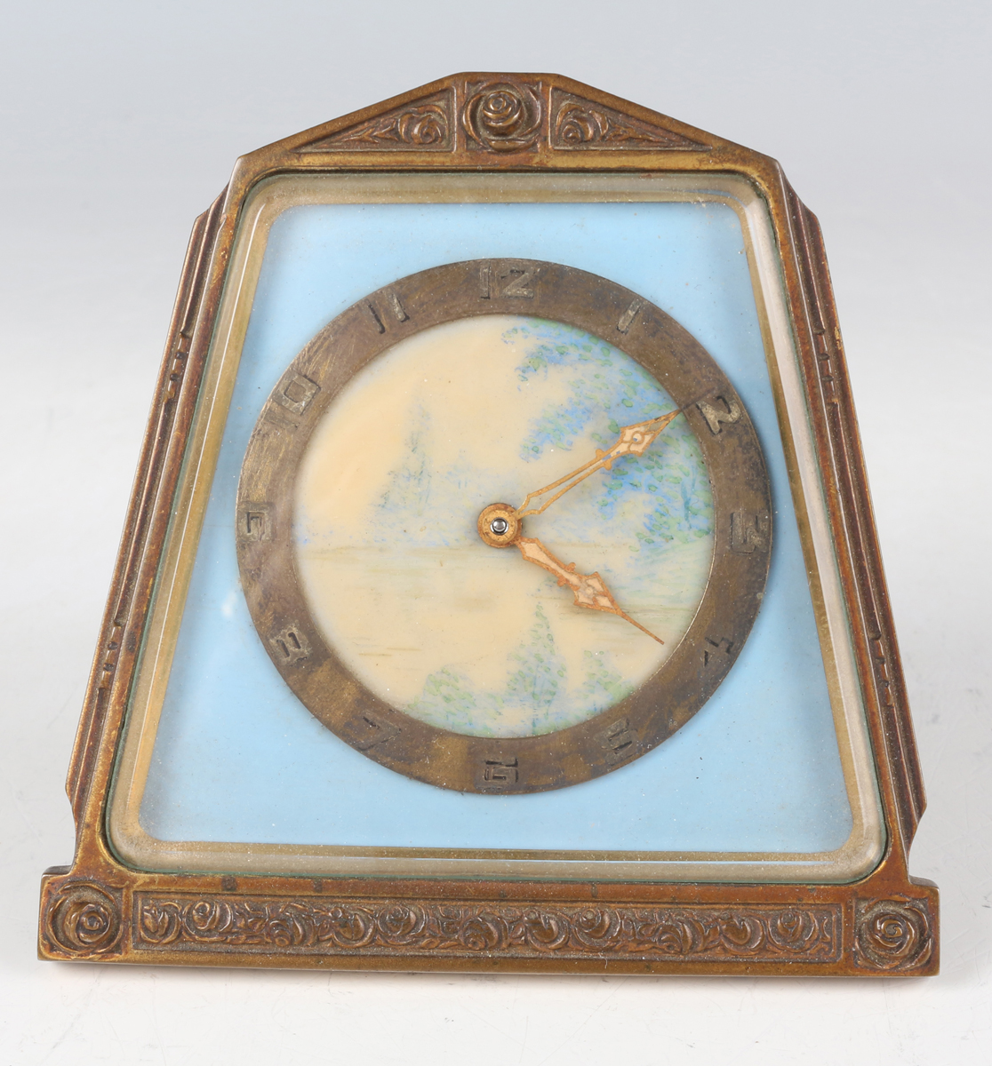 An Art Deco French gilt brass cased easel bedside timepiece, the dial painted with a landscape, the chapter ring with Arabic hour numerals, on a blue ground, the case cast with flowers and fitted with a hinged easel back, the case back numbered '103651', height 8cm.
