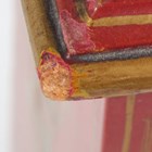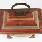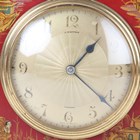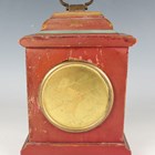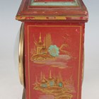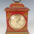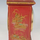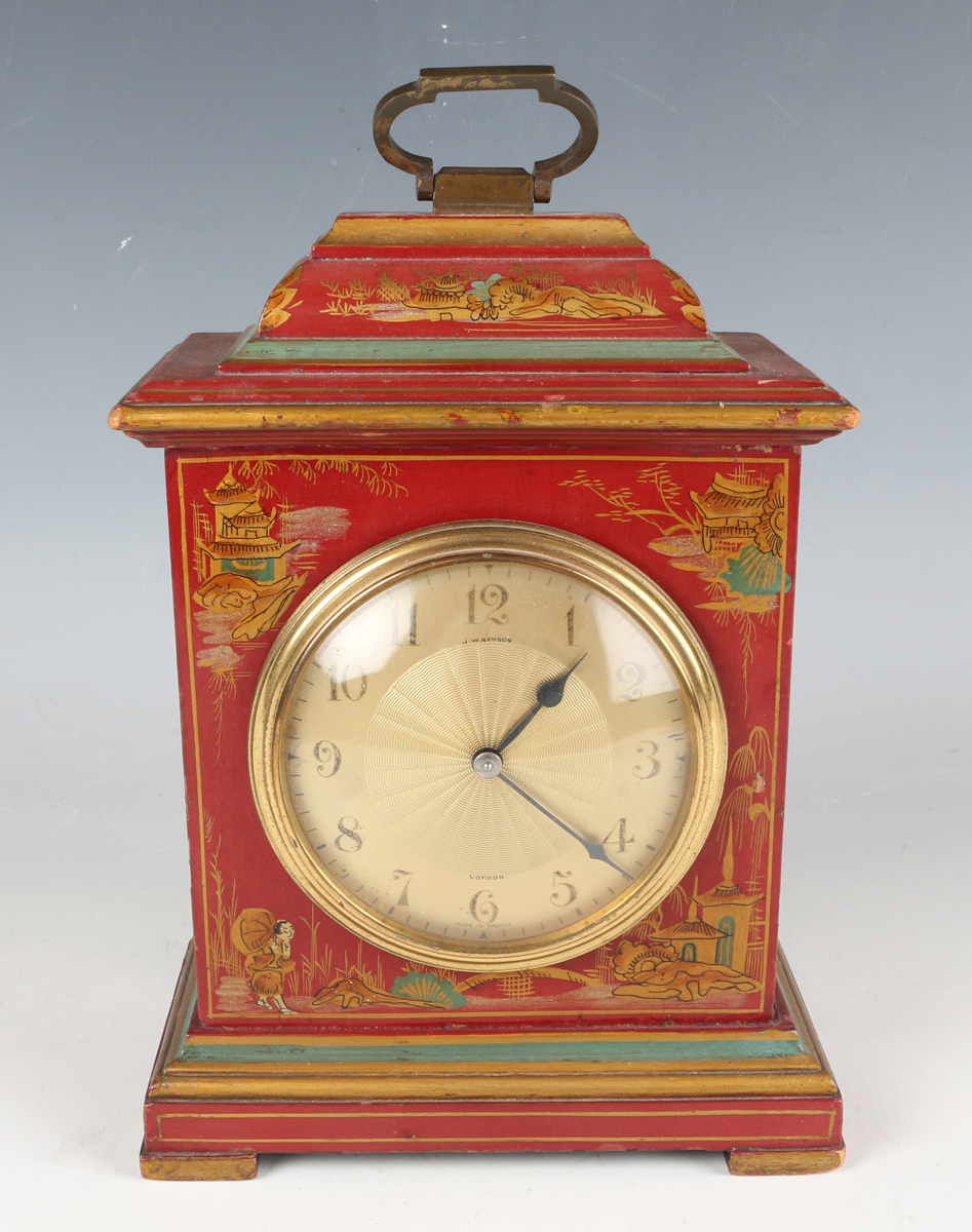 An early 20th century chinoiserie cased mantel timepiece, the eight day movement with platform escapement, the silvered circular dial with black Arabic hour numerals and detailed 'J.W. Benson London', the case decorated with gilt figures, pavilions and landscapes on a red ground, height 23cm.