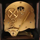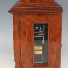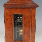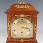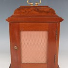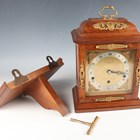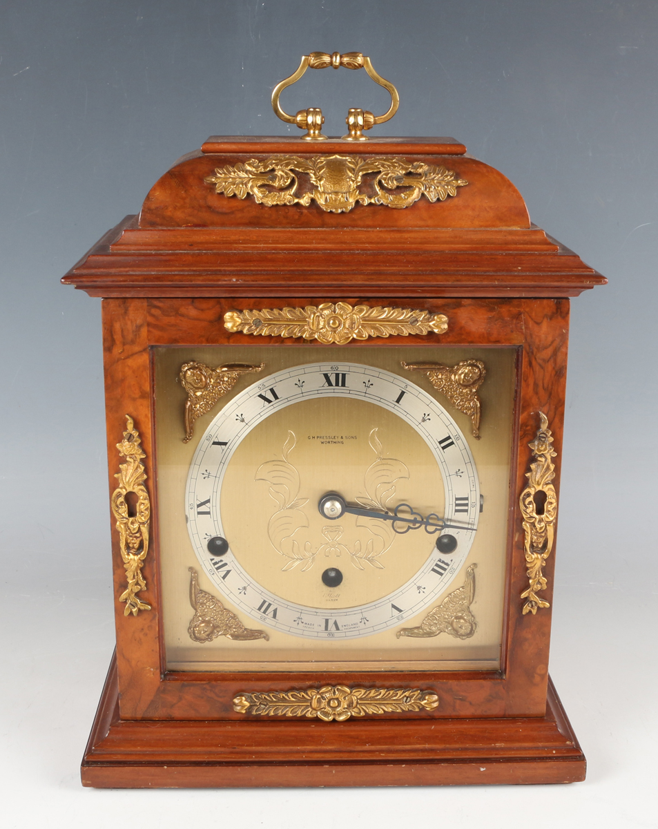 An 18th century style walnut bracket clock, the eight day three train movement with platform escapement, chiming on gongs, the backplate detailed 'F.W. Elliott Ltd', the gilt dial with silvered chapter ring, the case with brass handle surmount above a glazed door and sides, height 32.3cm, with bracket.