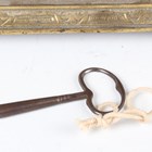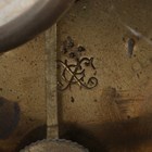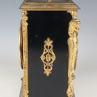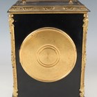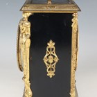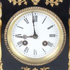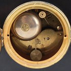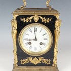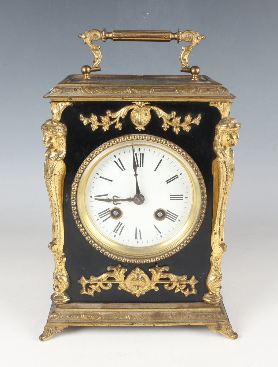 A late 19th century gilt brass and ebonized carriage style mantel clock with eight day movement striking on a bell, the white enamelled dial with black Roman hour numerals, the rectangular ebonized case with gilt brass swing handle and mounts, height 26cm.