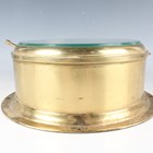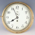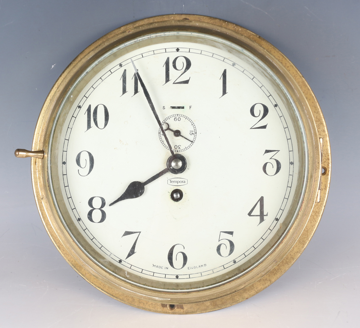 A 20th century brass circular cased ship's style wall timepiece, the 8-inch painted dial with black Arabic hour numerals, slow/fast indicator and subsidiary seconds, detailed 'Temora Made in England', case diameter 26.5cm.