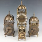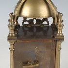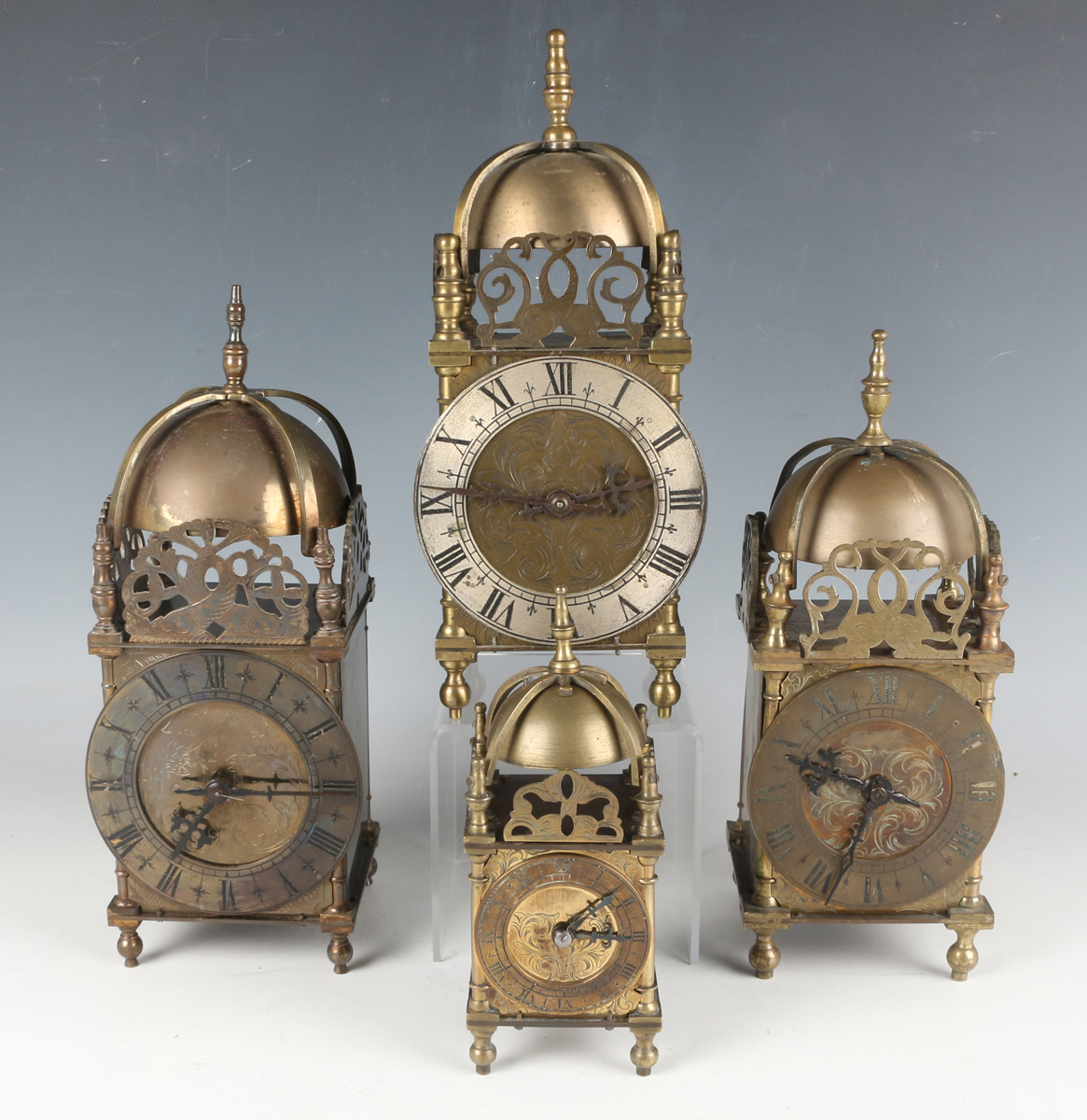 A mid-20th century brass lantern style timepiece, the movement with platform escapement and detailed 'Elliott London', the case of typical form, height 25.5cm, together with three other similar brass lantern style timepieces of various sizes, heights 26cm, 24cm and 16.5cm, with winding keys.