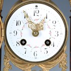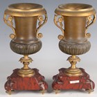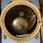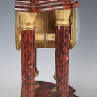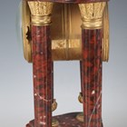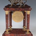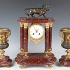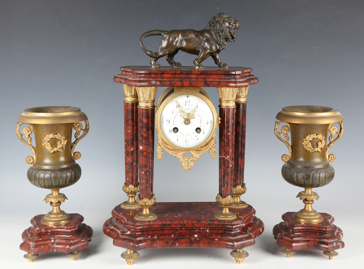 A late 19th century French gilt metal mounted rouge marble portico mantel clock garniture, the clock with eight day movement striking on a bell via an outside countwheel, the white enamelled dial with black Arabic hour numerals and flower festoons, the case with bronze lion surmount above four fluted columns, on a moulded base and toupie feet, height 42.5cm, with mask and starburst pendulum and winding key, flanked by a pair of urns.