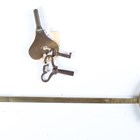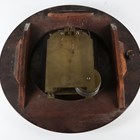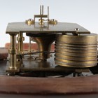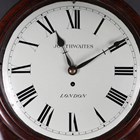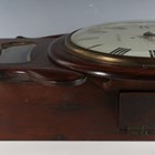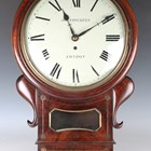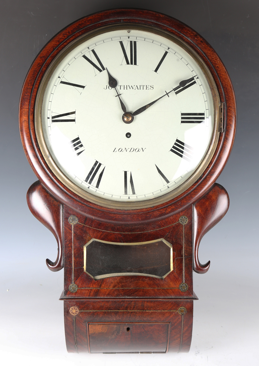 A Regency mahogany drop dial wall timepiece with eight day single chain fusee movement, the 12-inch painted dial with black Roman hour numerals and inscribed 'Jos Thwaites London', within a moulded circular surround with cast brass bezel and convex glass, the case with brass inlaid decoration, glazed lenticle and scroll mouldings above a bowed apron with door, height 64cm, with pendulum, winding key and case key.