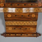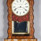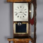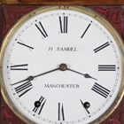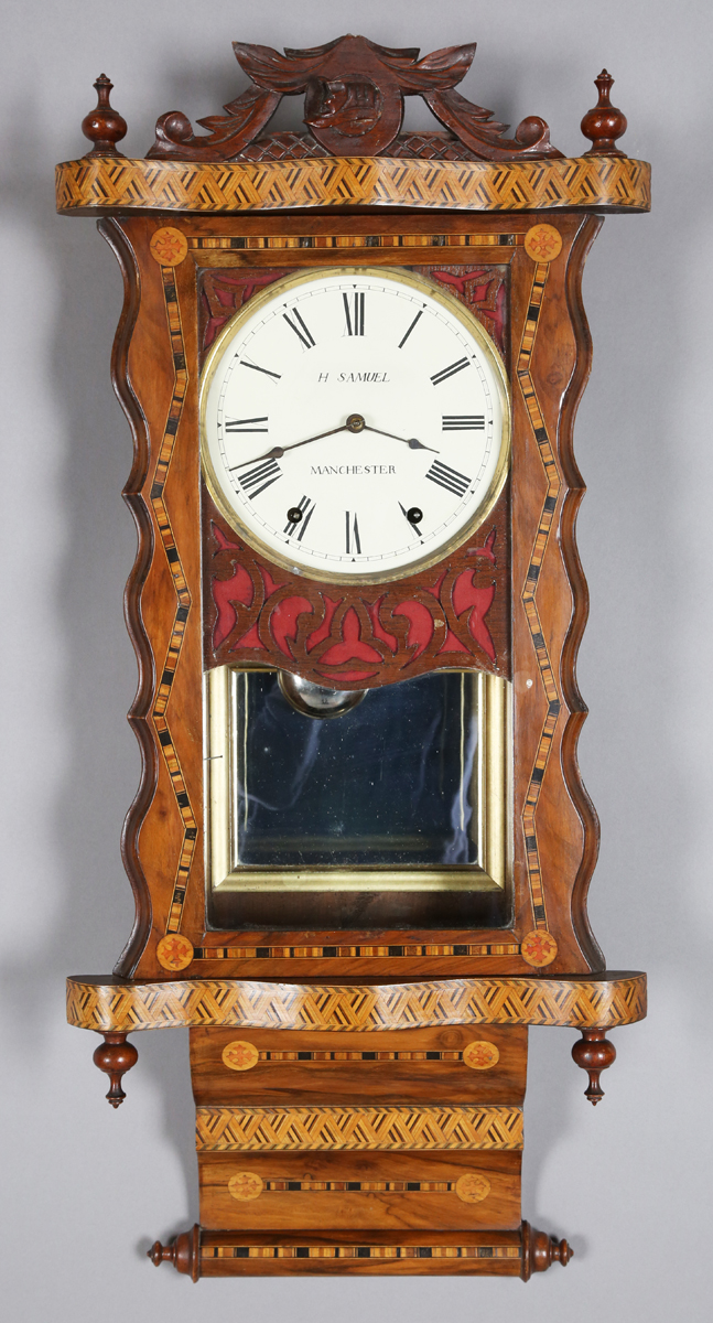 A late 19th century inlaid walnut wall clock with eight day movement striking on a bell, the painted dial inscribed 'H. Samuel Manchester', the case with carved and pierced foliate surmount above inlaid decoration and glazed door, height 89cm, with pendulum.