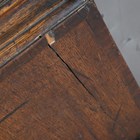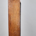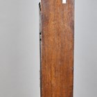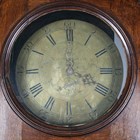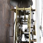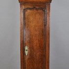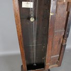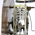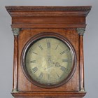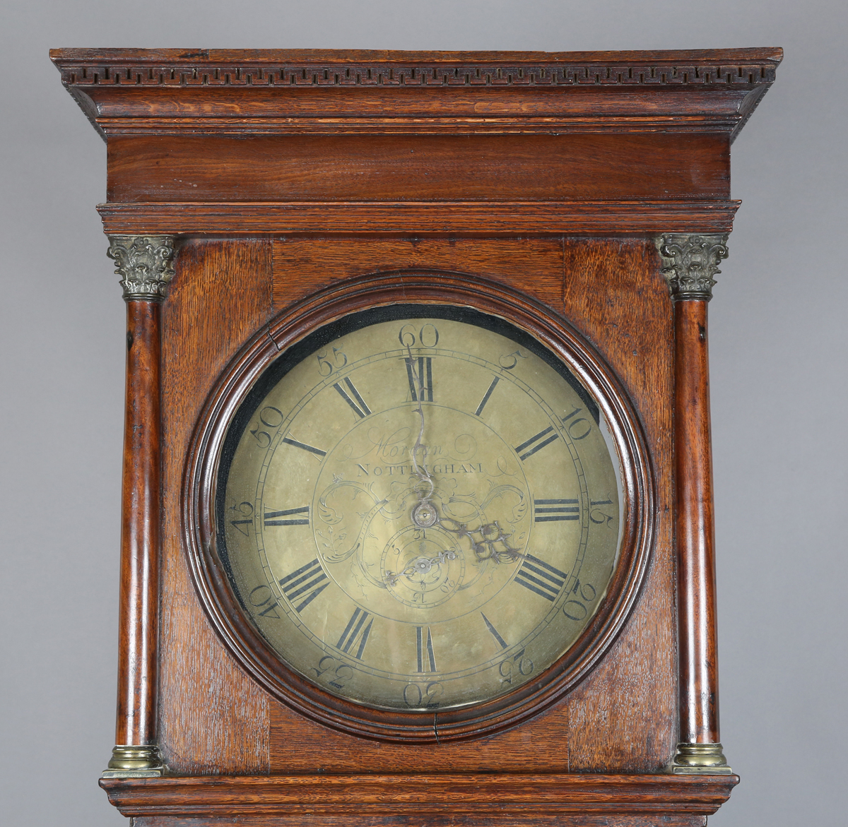 A George III oak longcase clock with thirty hour movement striking on a bell, the 12-inch circular brass dial with subsidiary date dial and inscribed 'Mordan Nottingham', the hood with dentil cornice, Corinthian columns and circular glazed aperture, above a crossbanded trunk door and base on bracket feet, height 210cm, with pendulum and weight.