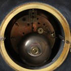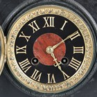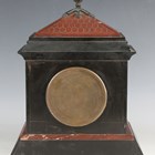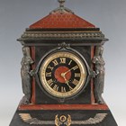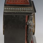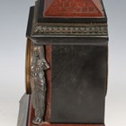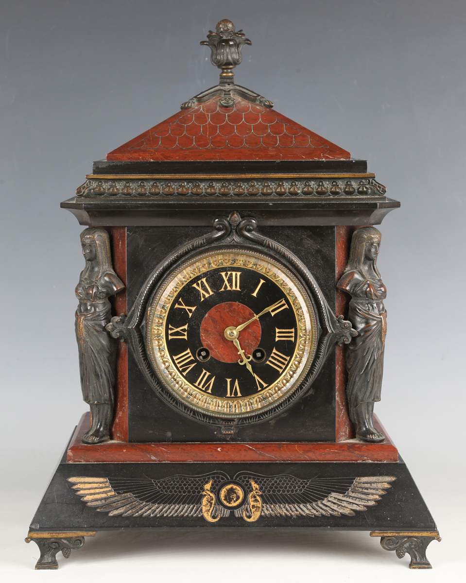 A late 19th century French Egyptianesque slate and rouge marble mantel clock with eight day movement striking on a bell, the dial with gilt Roman hour numerals, the architectural case with urn finial above a pair of bronze female figure columns, on a rectangular base with incised and gilt wings of Horus decoration, height 36.5cm, with pendulum.
