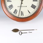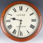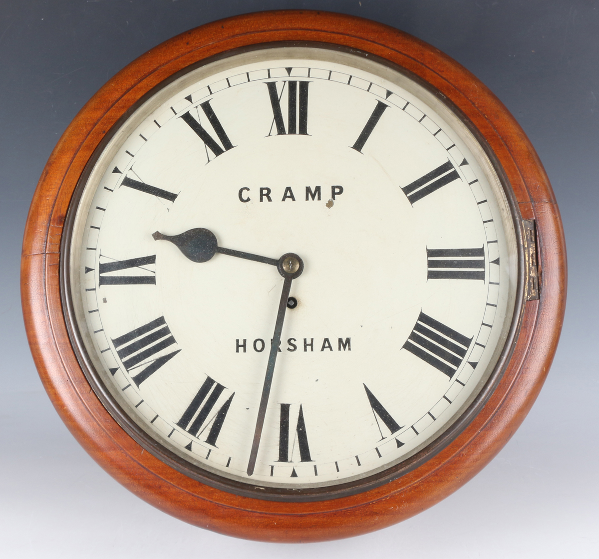 An early 20th century mahogany circular cased wall timepiece with eight day single fusee movement, the 14-inch painted circular dial with black Roman hour numerals and detailed 'Cramp Horsham', within a moulded surround, case diameter 44cm, with pendulum, case key and winding key.