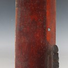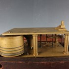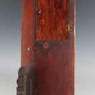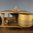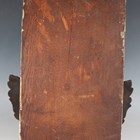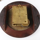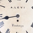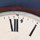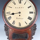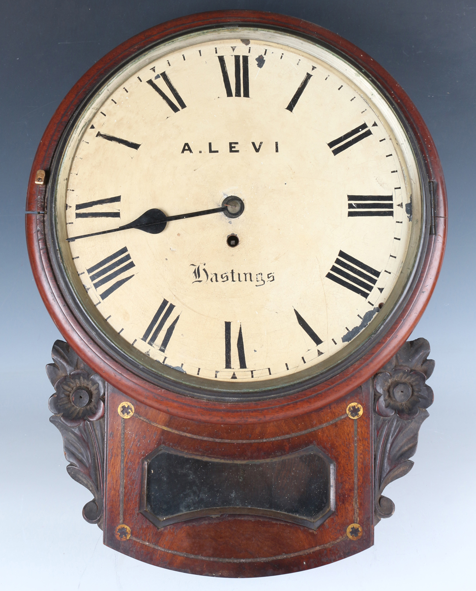 An early Victorian mahogany drop dial wall clock with eight day single fusee movement, the 12-inch painted dial with black Roman hour numerals and detailed 'A. Levi Hastings', within a moulded surround, above a glazed lenticle, brass inlay and carved floral mouldings, case diameter 36.5cm, with pendulum (fault).