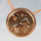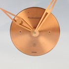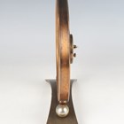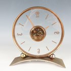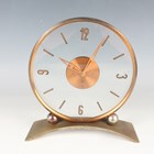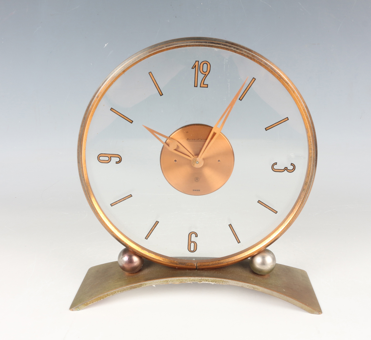 A Jaeger-LeCoultre brass circular cased mantel timepiece with signed eight day movement, the clear glazed dial with gilt Arabic numeral and baton shaped hour markers, above ball supports and an arched rectangular base, height 18.7cm.