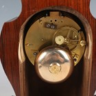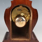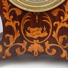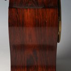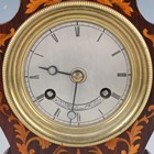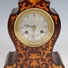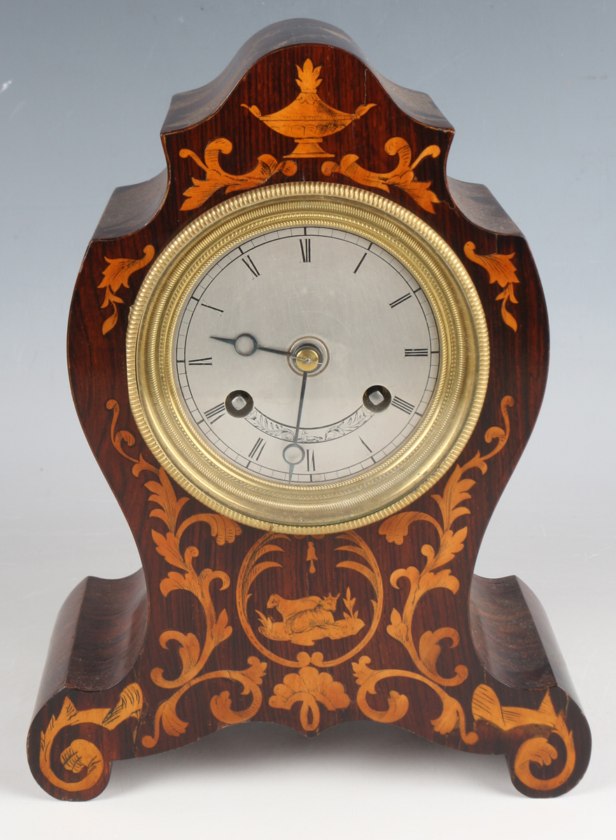 A late 19th century French inlaid rosewood mantel clock, the eight day movement with platform escapement, striking on a bell via an outside countwheel, the silvered circular dial with black Roman hour numerals, the shaped balloon case with inlaid satinwood foliate scrolls, height 22.1cm.