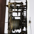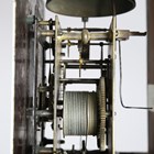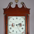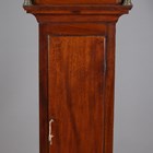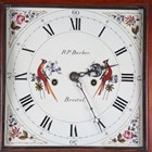 A George III mahogany longcase clock with eight day movement striking on a bell, the 12-inch painted square dial with black Roman hour numerals and inscribed 'R.P. Barber Bristol', the hood with swan neck pediment, glazed door and fluted columns above a plain rectangular trunk door, base and bracket feet, height 209cm, with pendulum and two weights. Note: Richard Price Barber is a recorded clockmaker and goldsmith working in Bristol circa 1789.